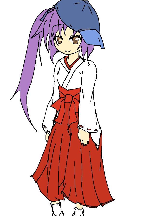 服は巫女服で、つり目で紫髪のロングのサイドポニーで僕っ娘で帽子で天然な感じのキャラ